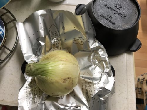 スノーピークのコロダッチポットに玉ねぎを入れます。
