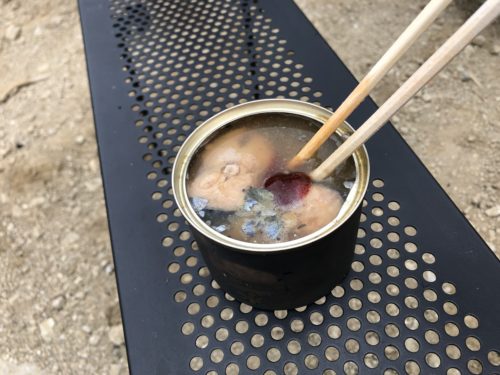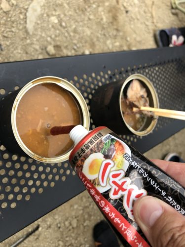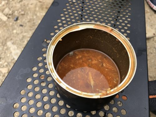 で、焚き火の上に乗せた缶詰の中の汁が
